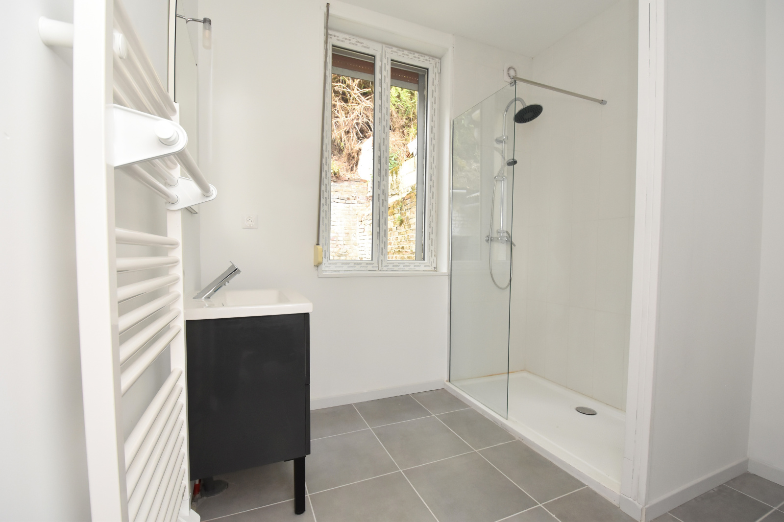 Menuseries PVC double vitrage avec volets roualnts électriques en façade, chauffage électrique par radiateurs à intertie de marque ATLANTIC.