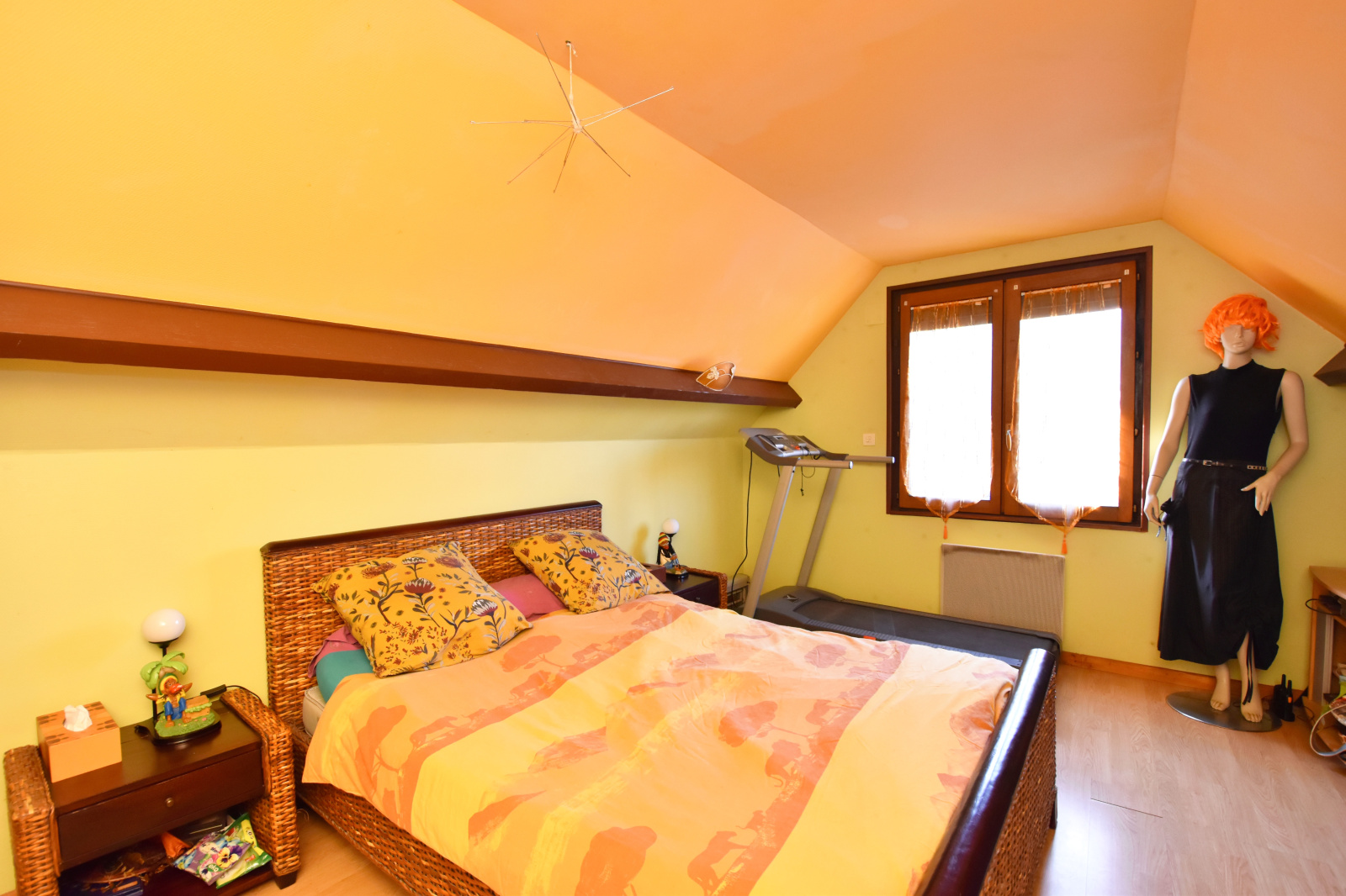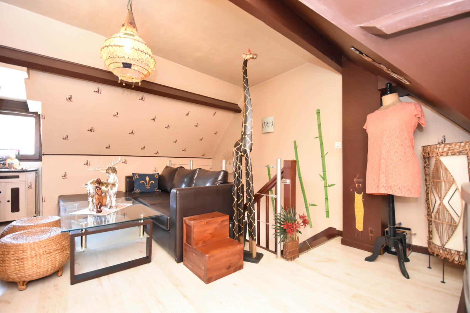 - À l'étage : un palier dessert une chambre et un bureau.