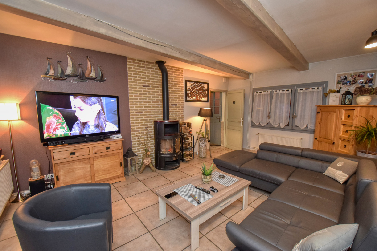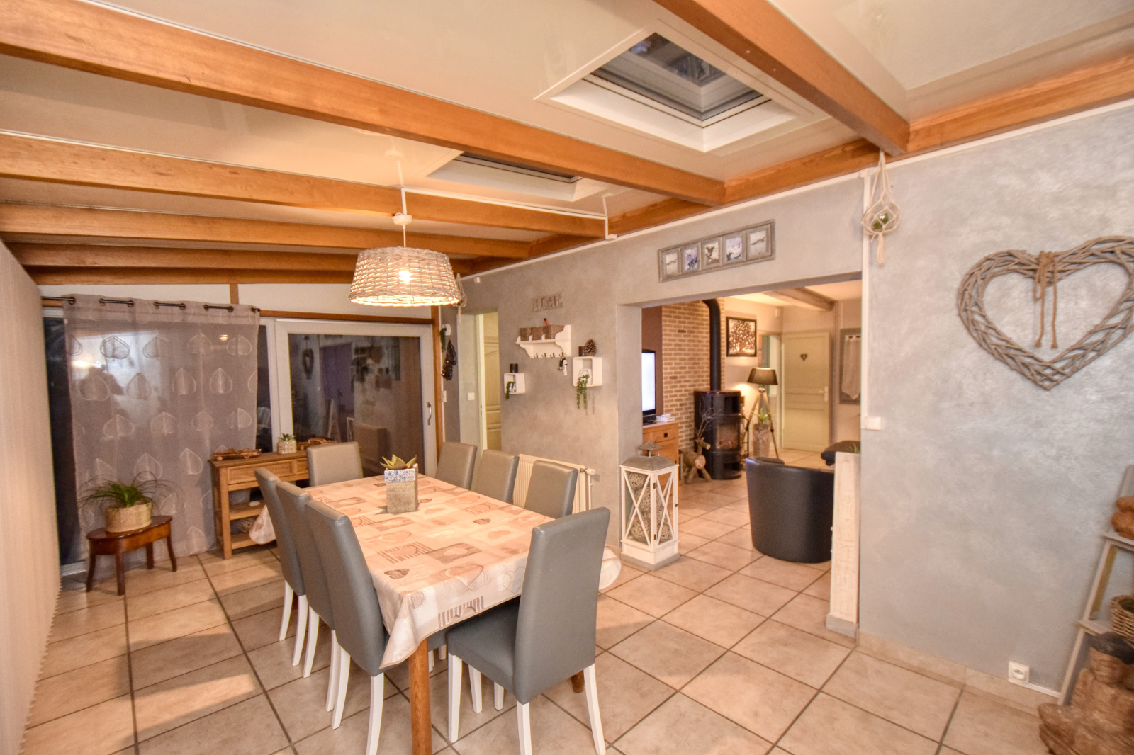 Au rez de chaussée: Hall d'entrée, cuisine aménagée et équipée, salon avec poêle à bois, salle à manger, salle d'eau, W.C, chaufferie.