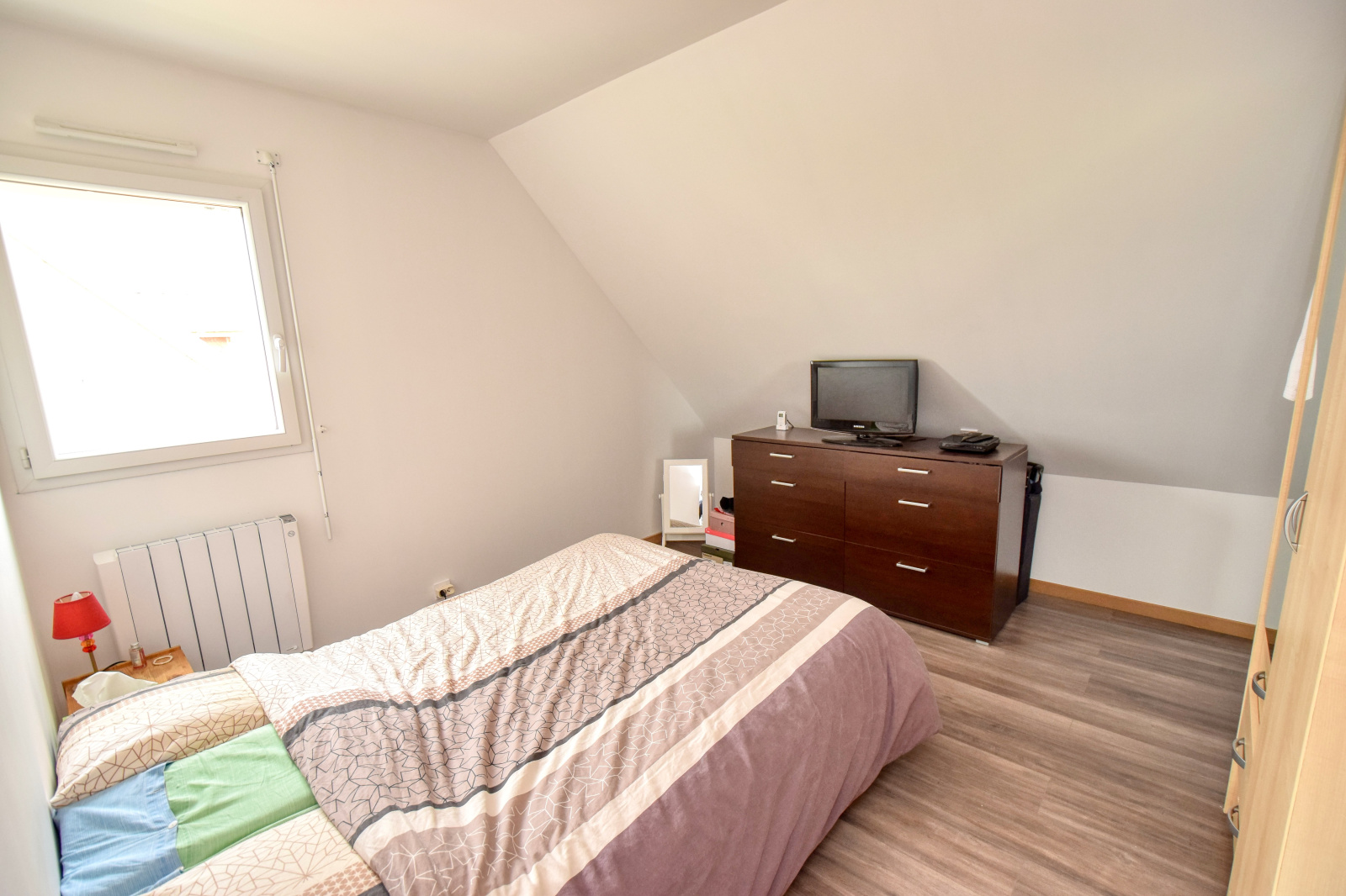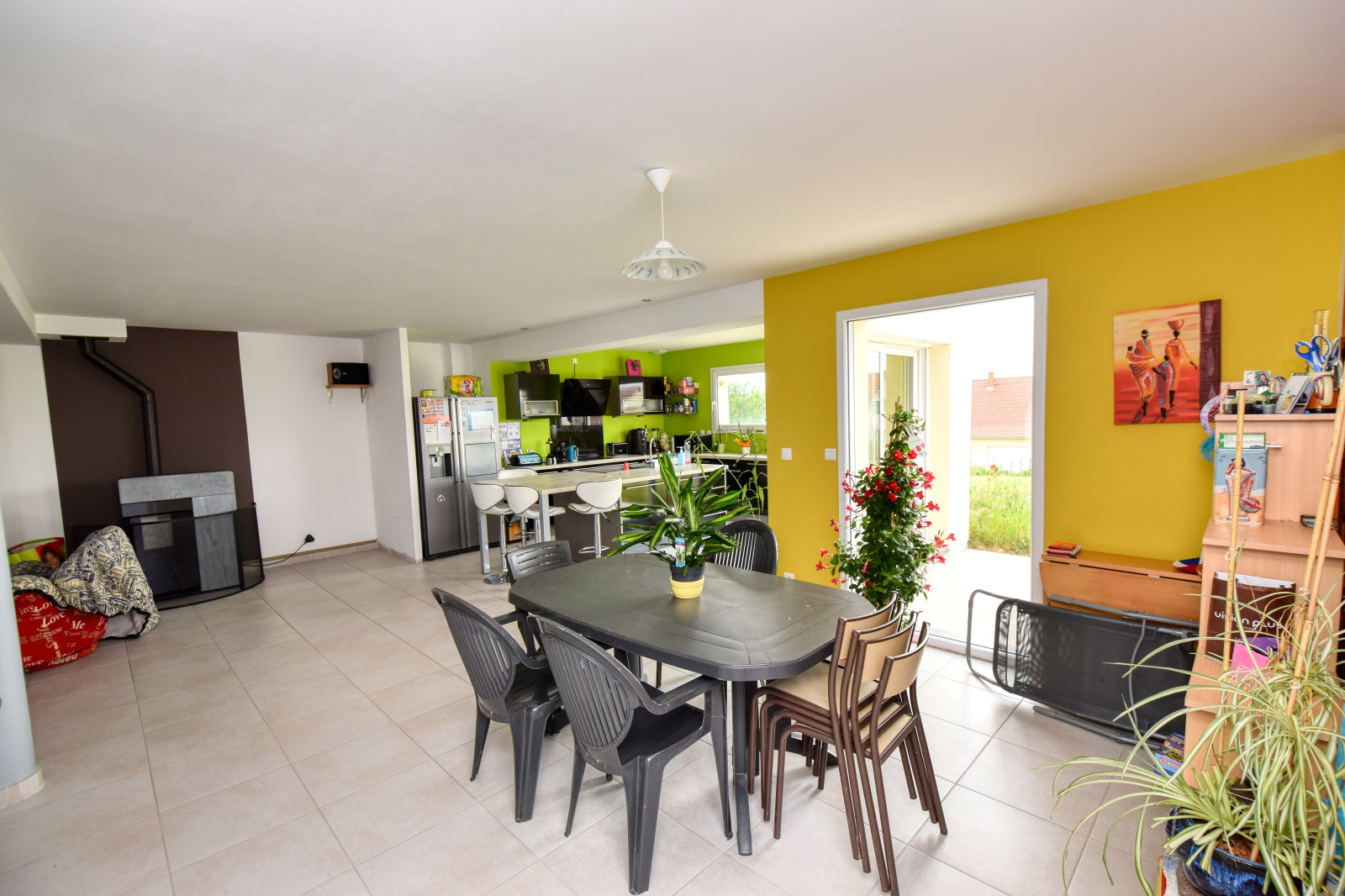 Chauffage mixte par granules de bois + électrique caloporteur, menuiseries PVC et Alu double vitrage + volets roulants.