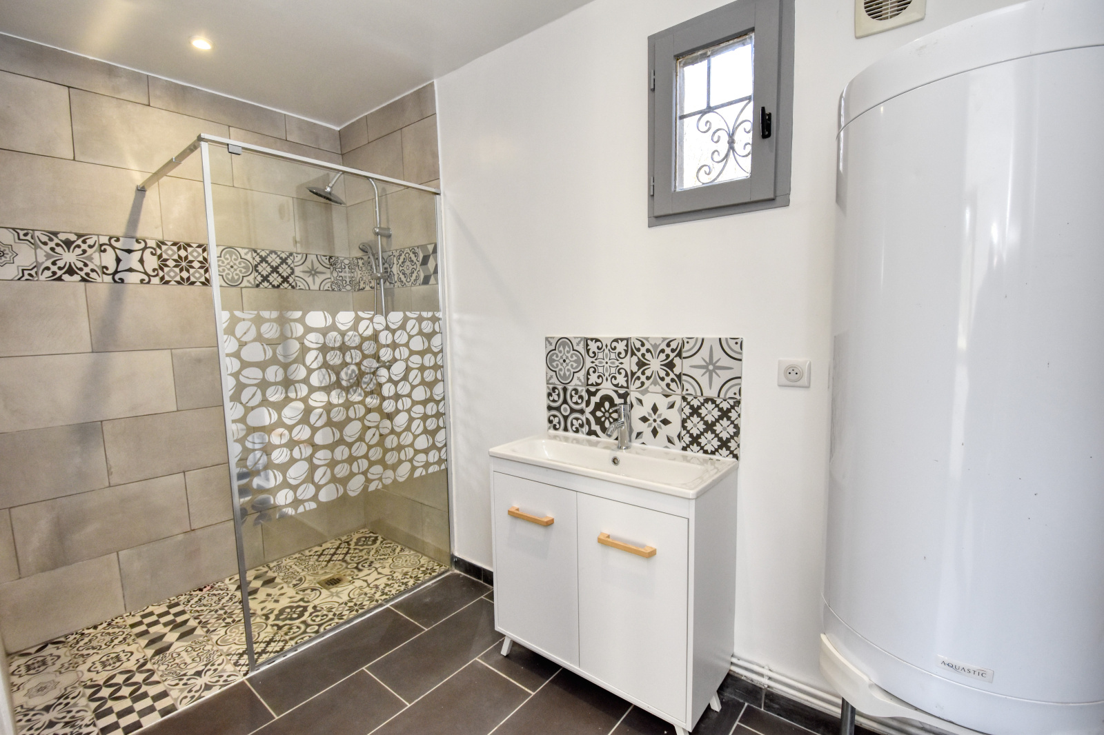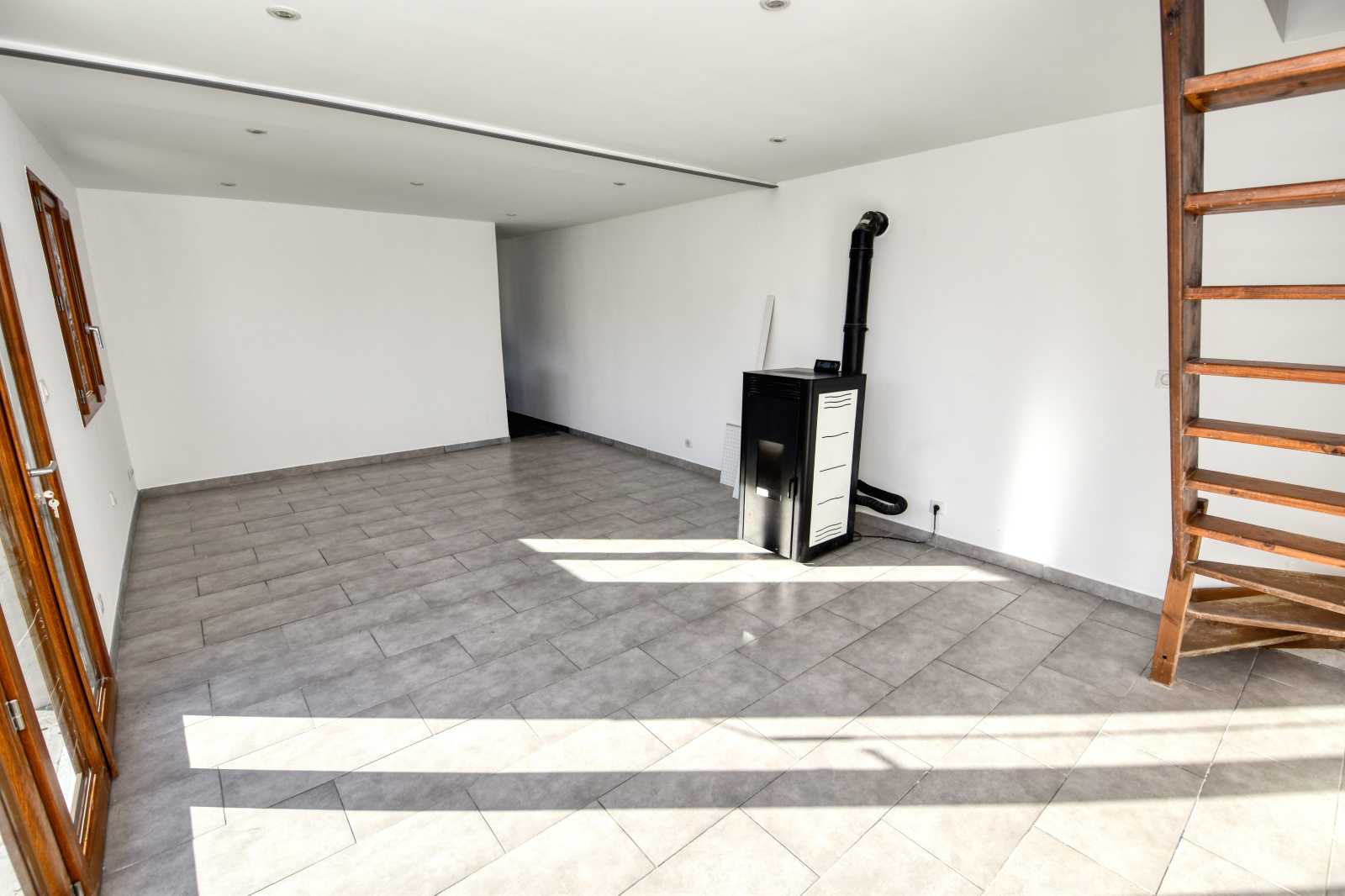 - Au rez-de-chaussée : Grande pièce à vivre de 53m2 avec cuisine entièrement équipée ouverte à l'américaine et poêle à bois, un beau salon de 26m2 avec poêle à granules, salle d'eau (avec douche italienne), cellier/lingerie, W.C.