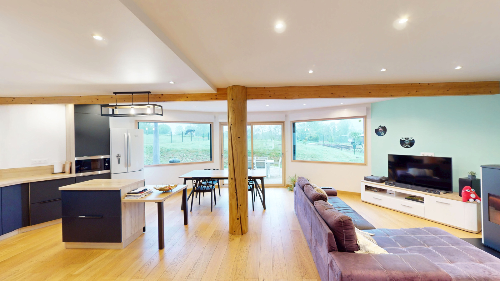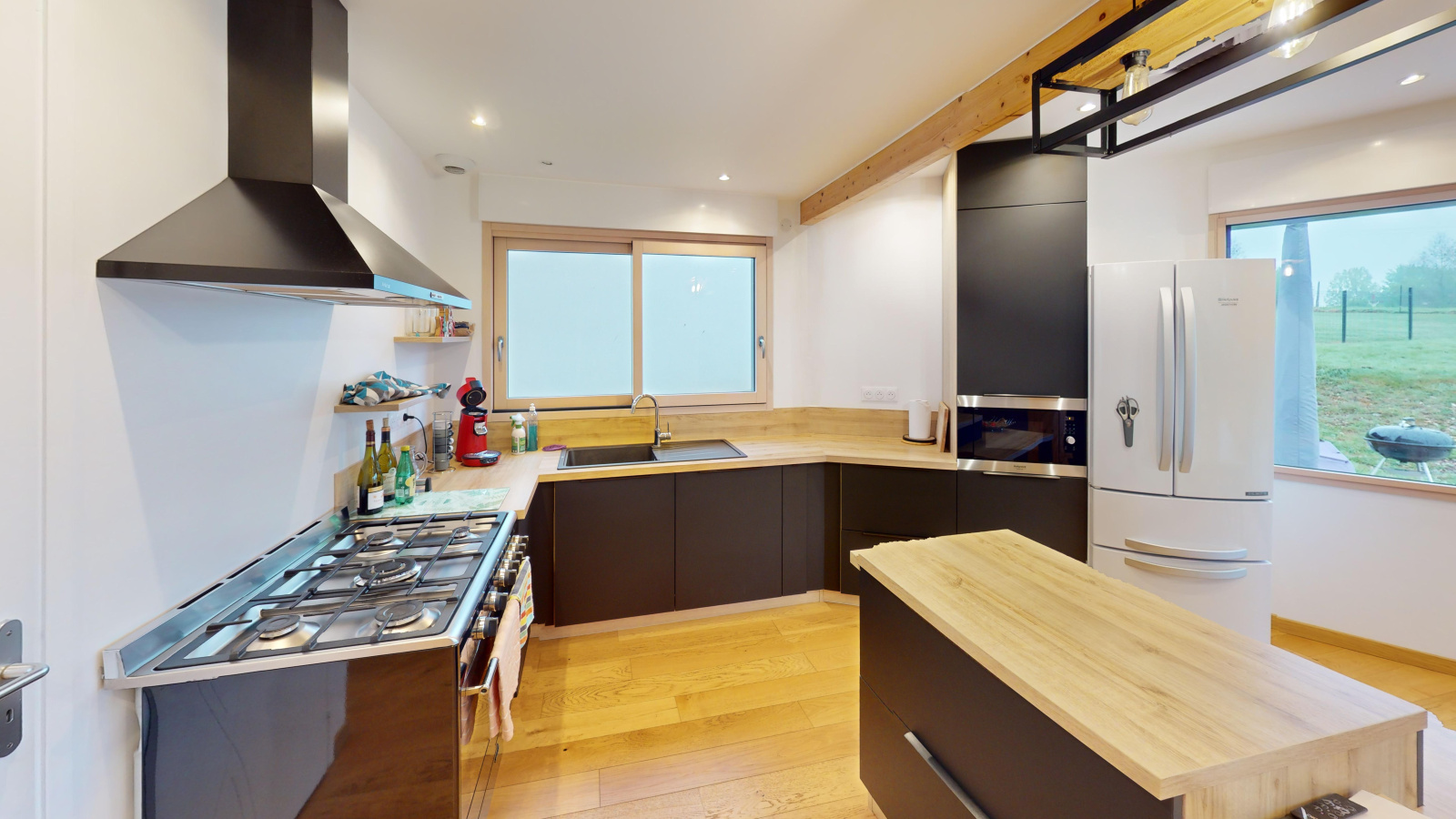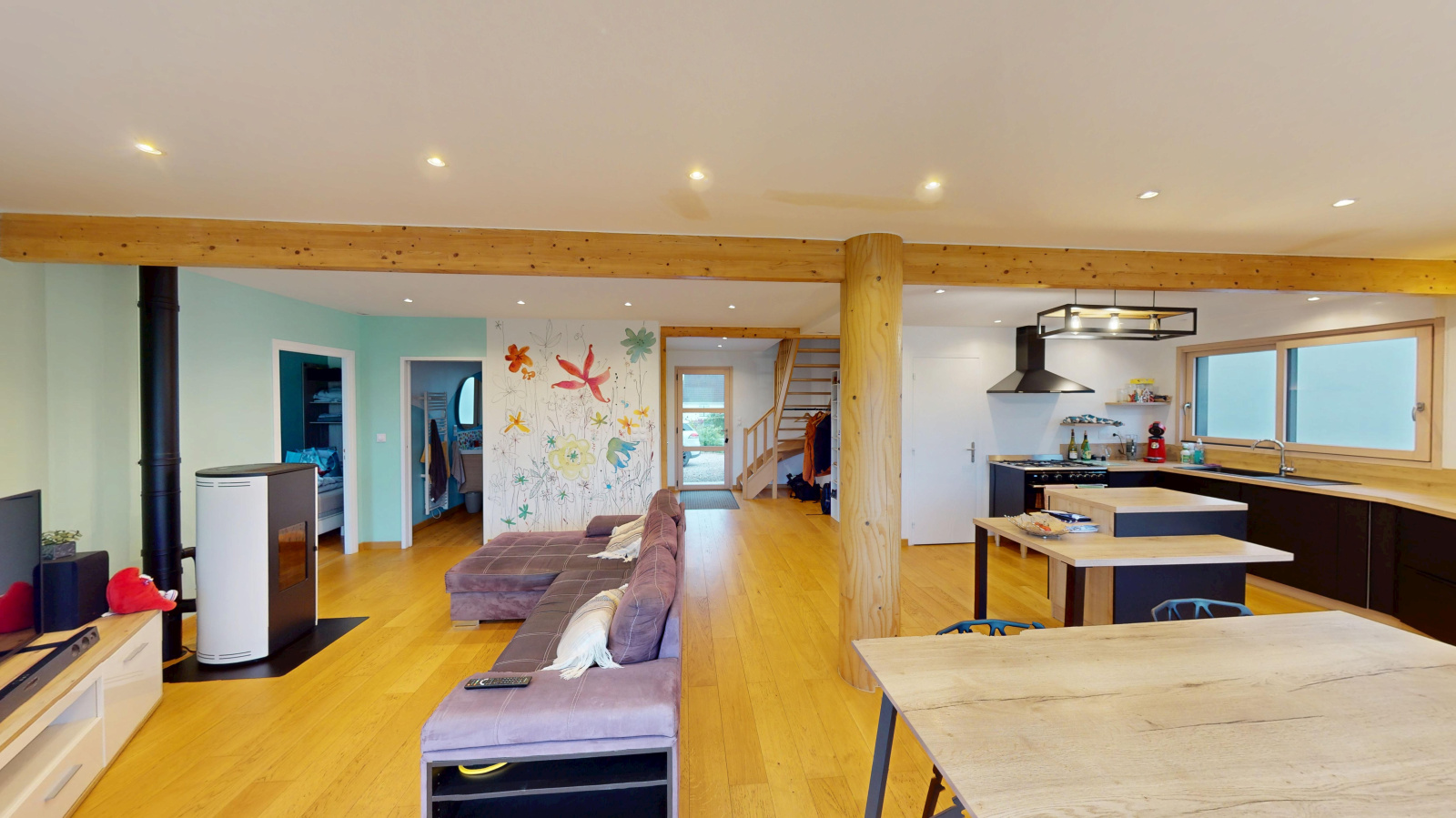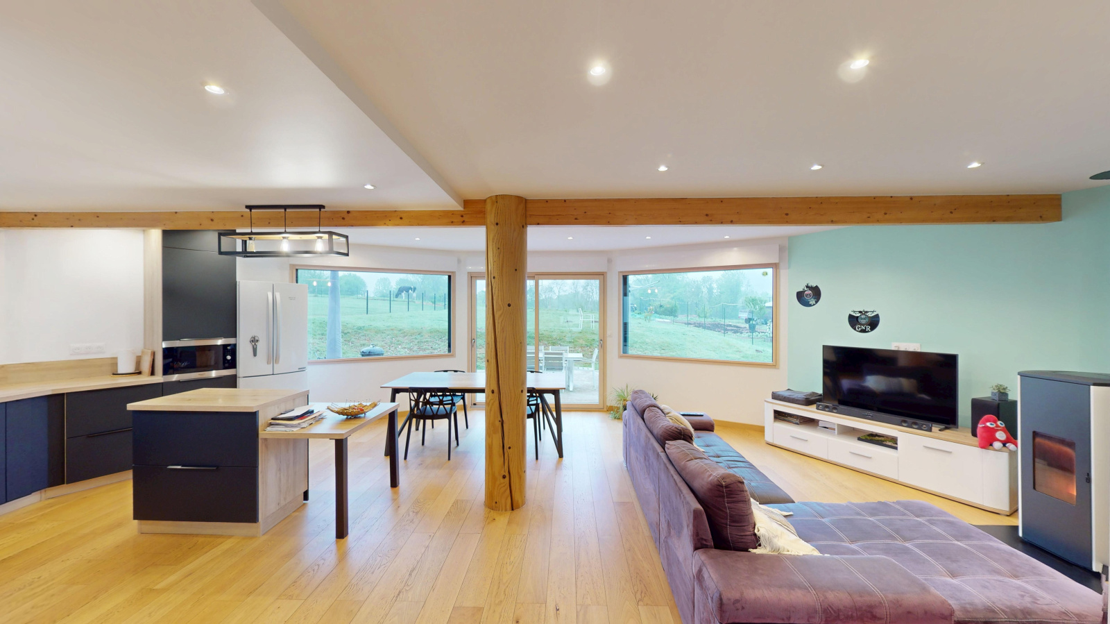 La maison est équipée de matériaux de qualité : menuiseries alu/bois, double vitrage, volets roulants électriques, chauffage par poêle à granulés, ventilation double flux et ballon thermodynamique pour l’eau chaude.