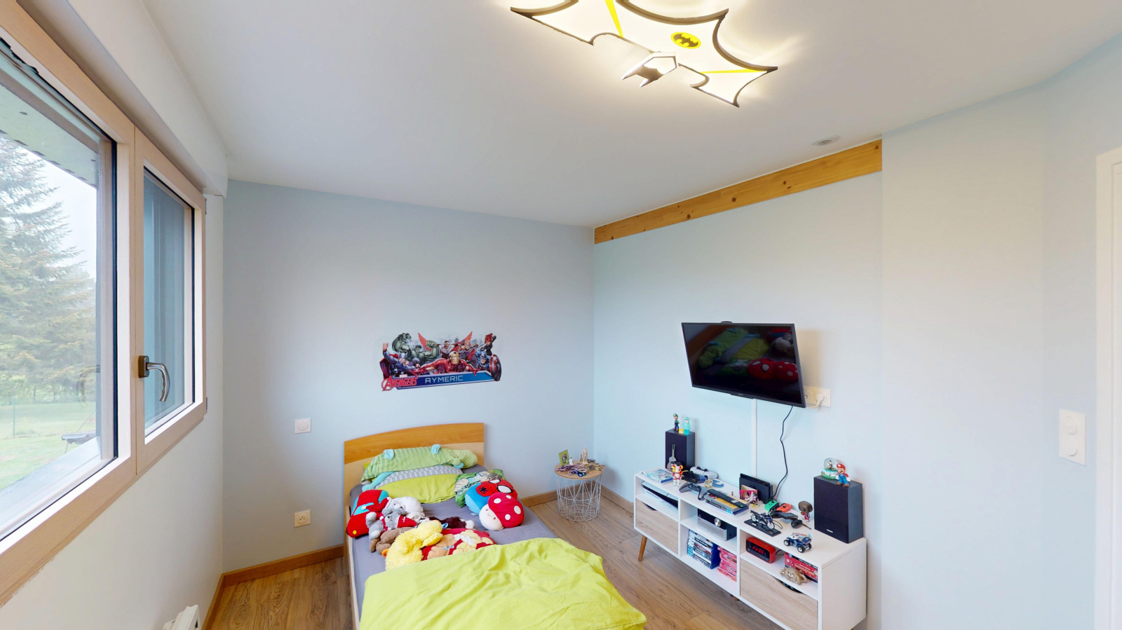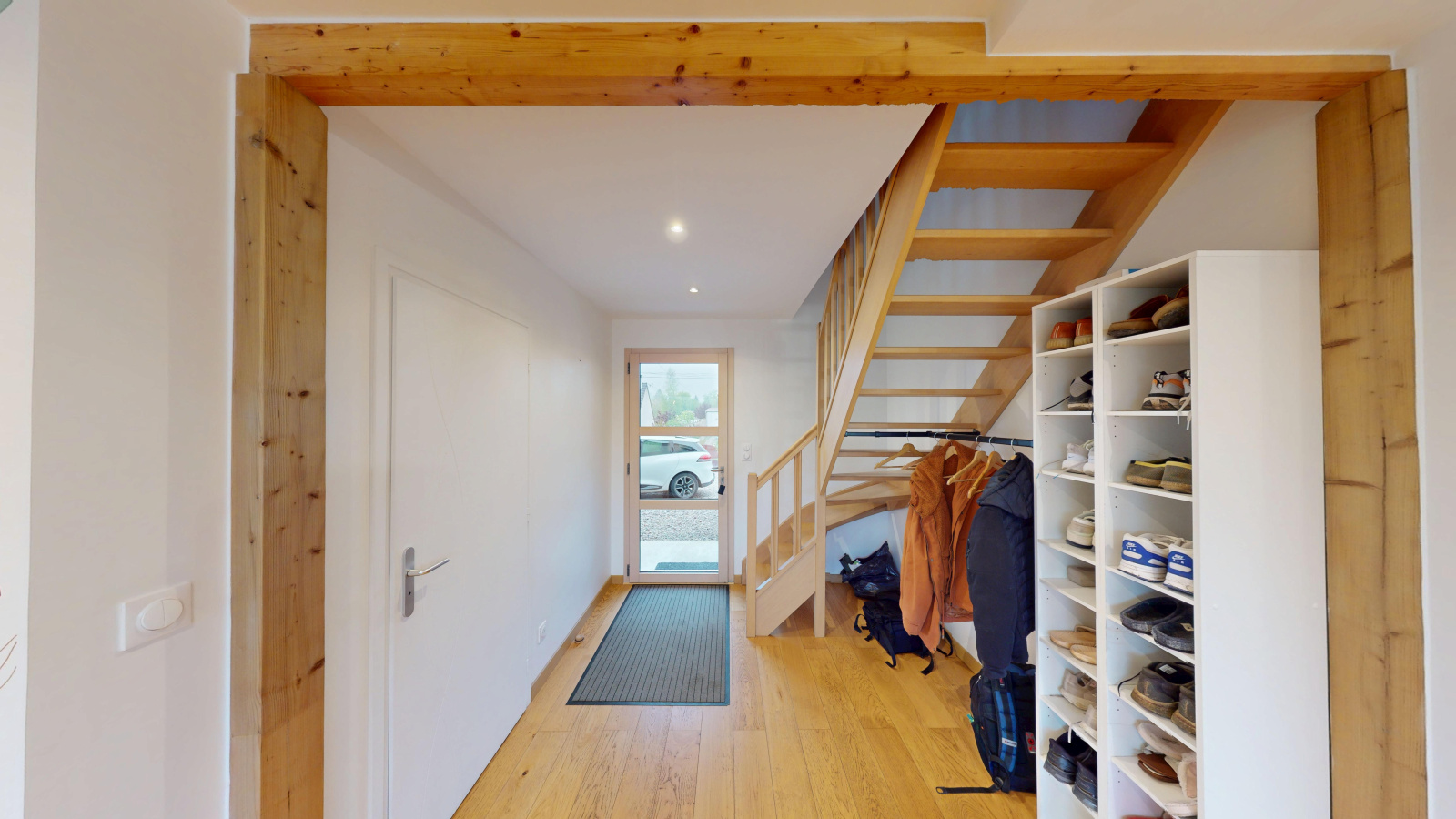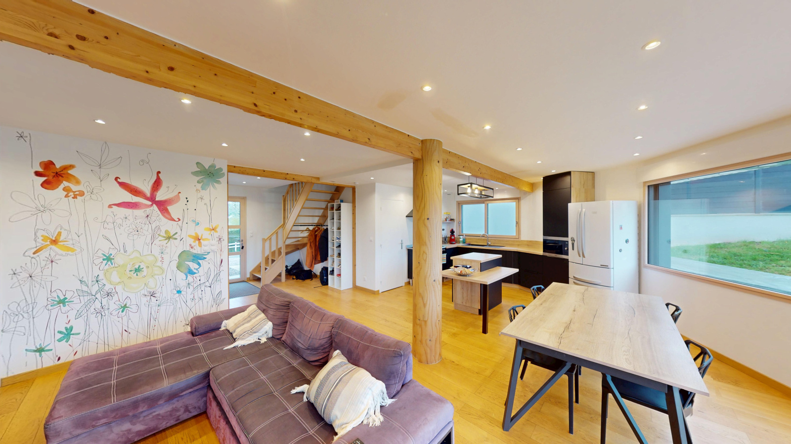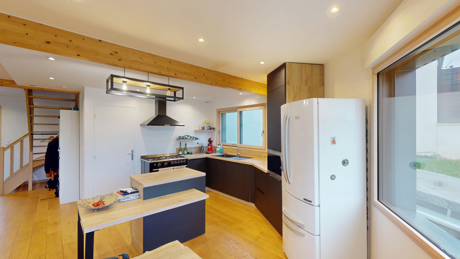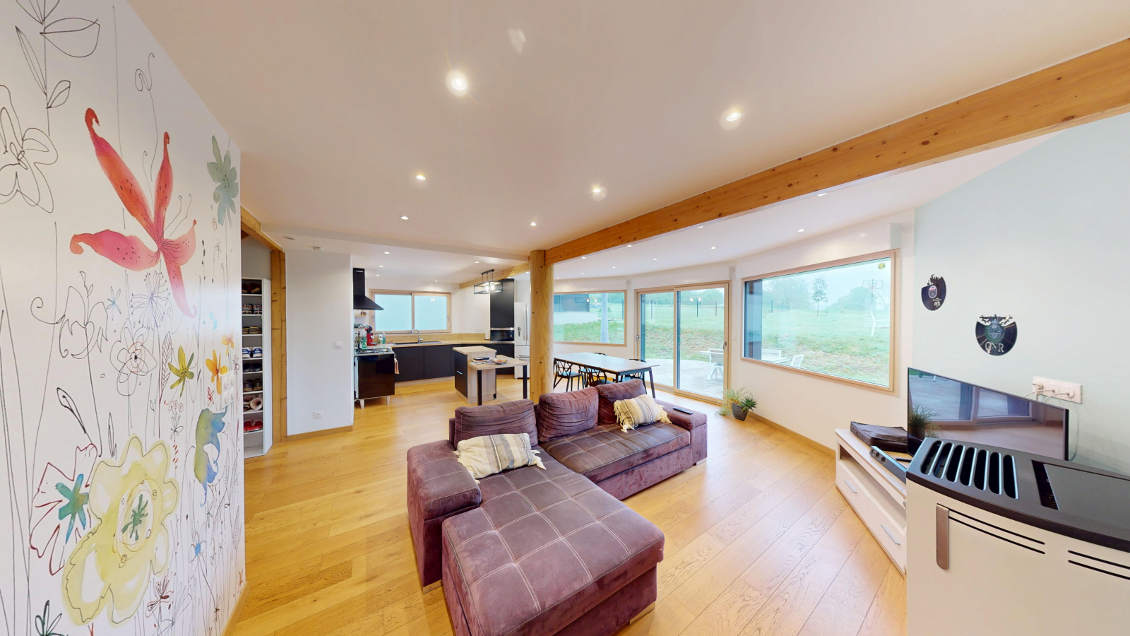 La maison est équipée de matériaux de qualité : menuiseries alu/bois, double vitrage, volets roulants électriques, chauffage par poêle à granulés, ventilation double flux et ballon thermodynamique pour l’eau chaude.