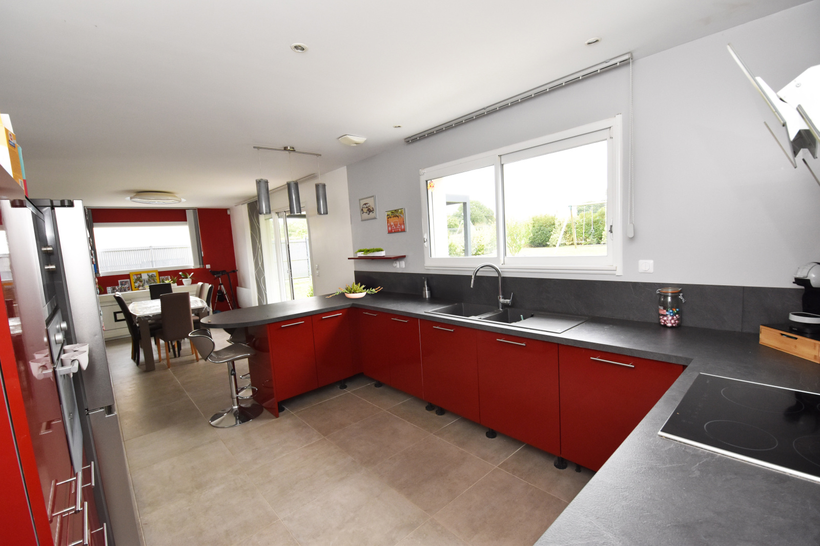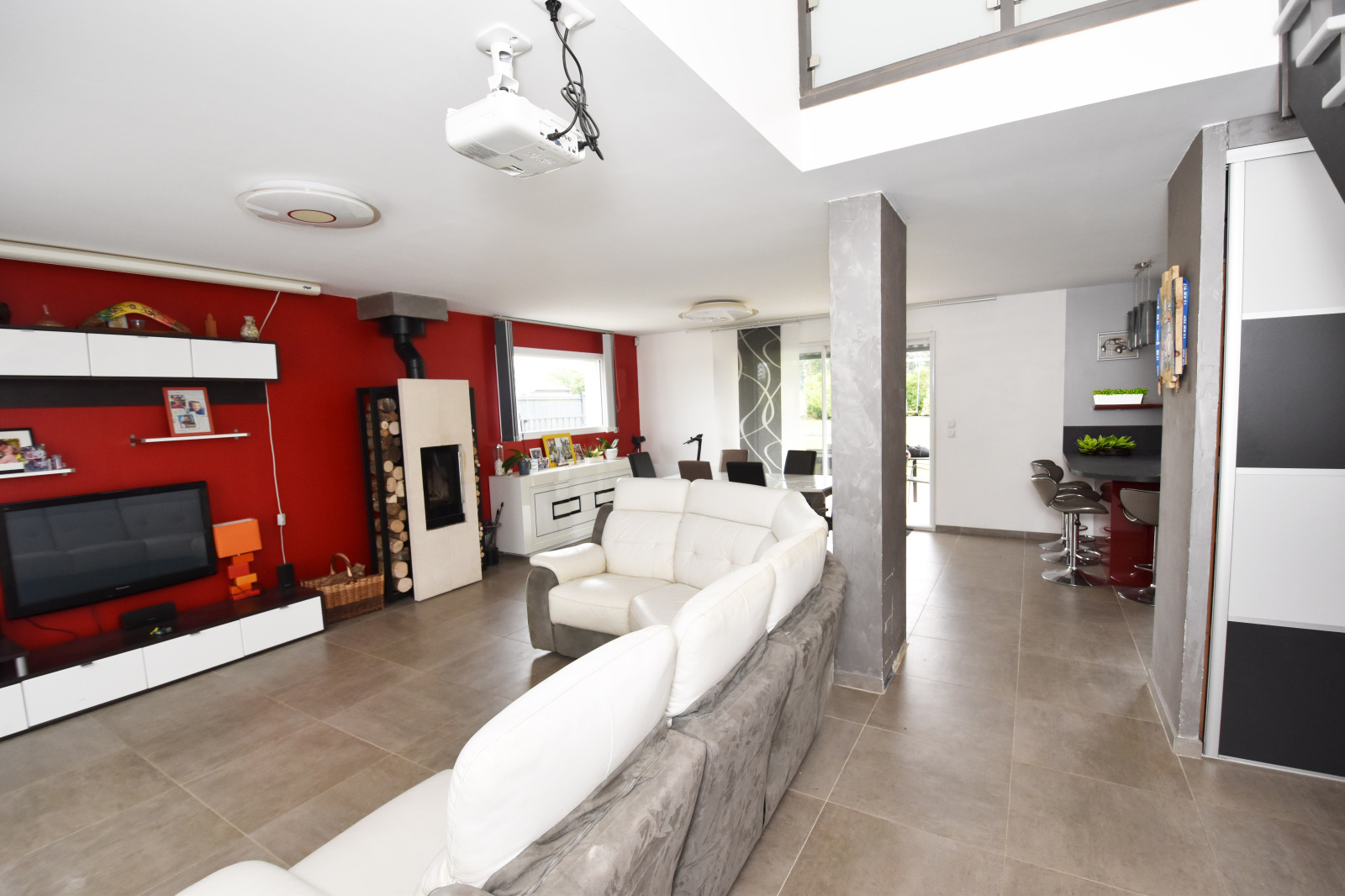 - Au rez-de-chaussée : Hall d'entrée avec penderie, grande pièce à vivre de 50m2 baignée de lumière avec cuisine équipée ouverte à l'américaine et poêle à bois, une suite parentale avec douche italienne, W.C. avec lave-mains. Cellier/lingerie, atelier et garage de 20m2 avec porte motorisée.