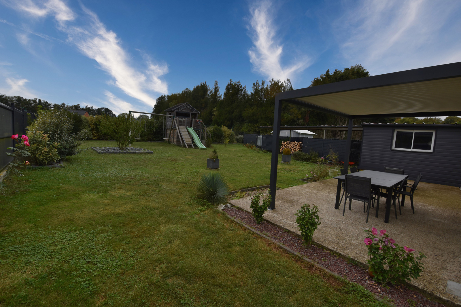 Grande cour à l'avant permettant de stationner de nombreux véhicules. Terrasse avec pergola en aluminium et store banne. Jardin. Abri à bois. Jardin.