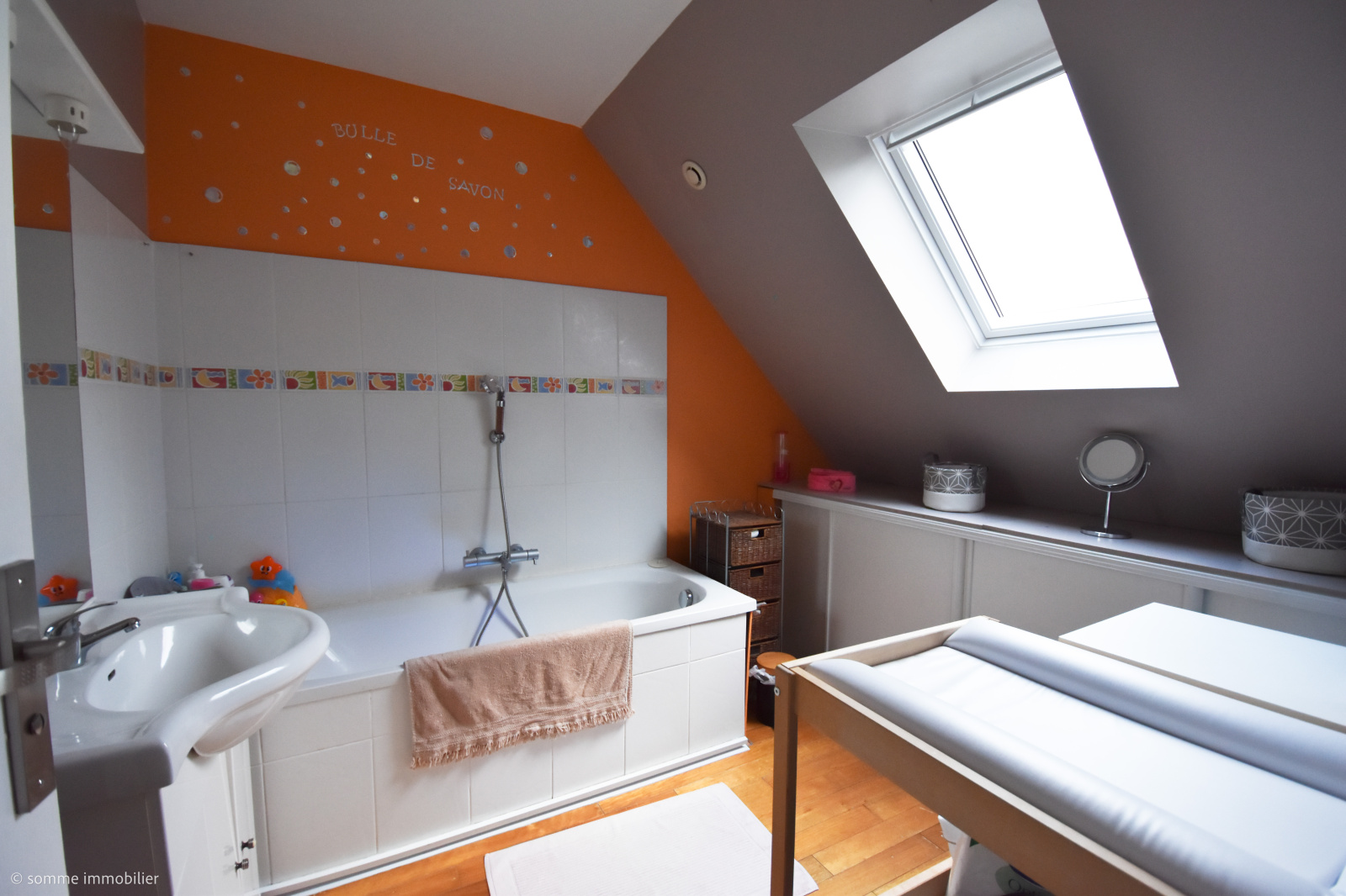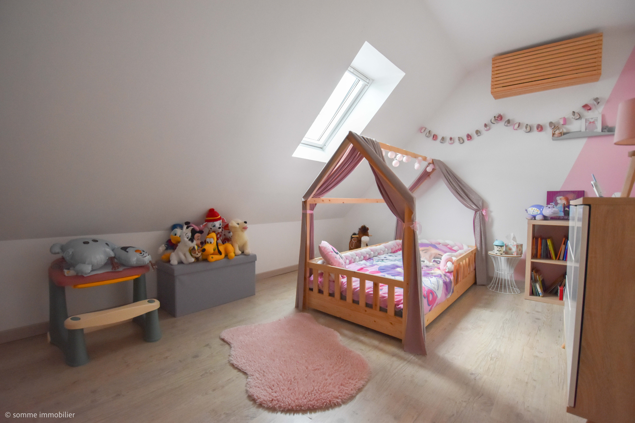 À l’étage, un palier, bureau, trois chambres, une salle de bains .