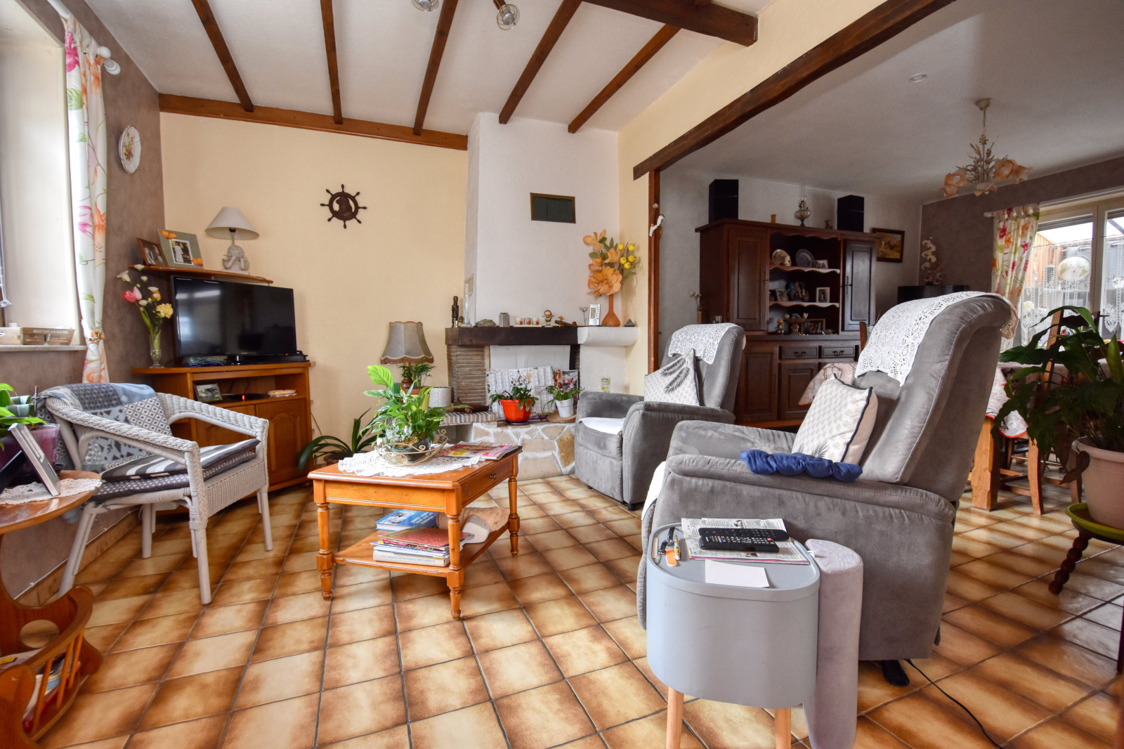 - Au rez-de-chausée : hall d'entrée, séjour/salon de 28m² avec cheminée feu de bois insert, cuisine aménagée et équipée ouverte par passe-plats, véranda de 12 m², W.C.
