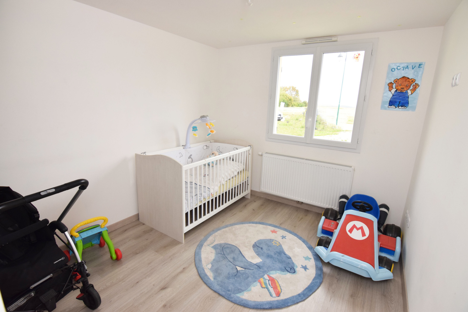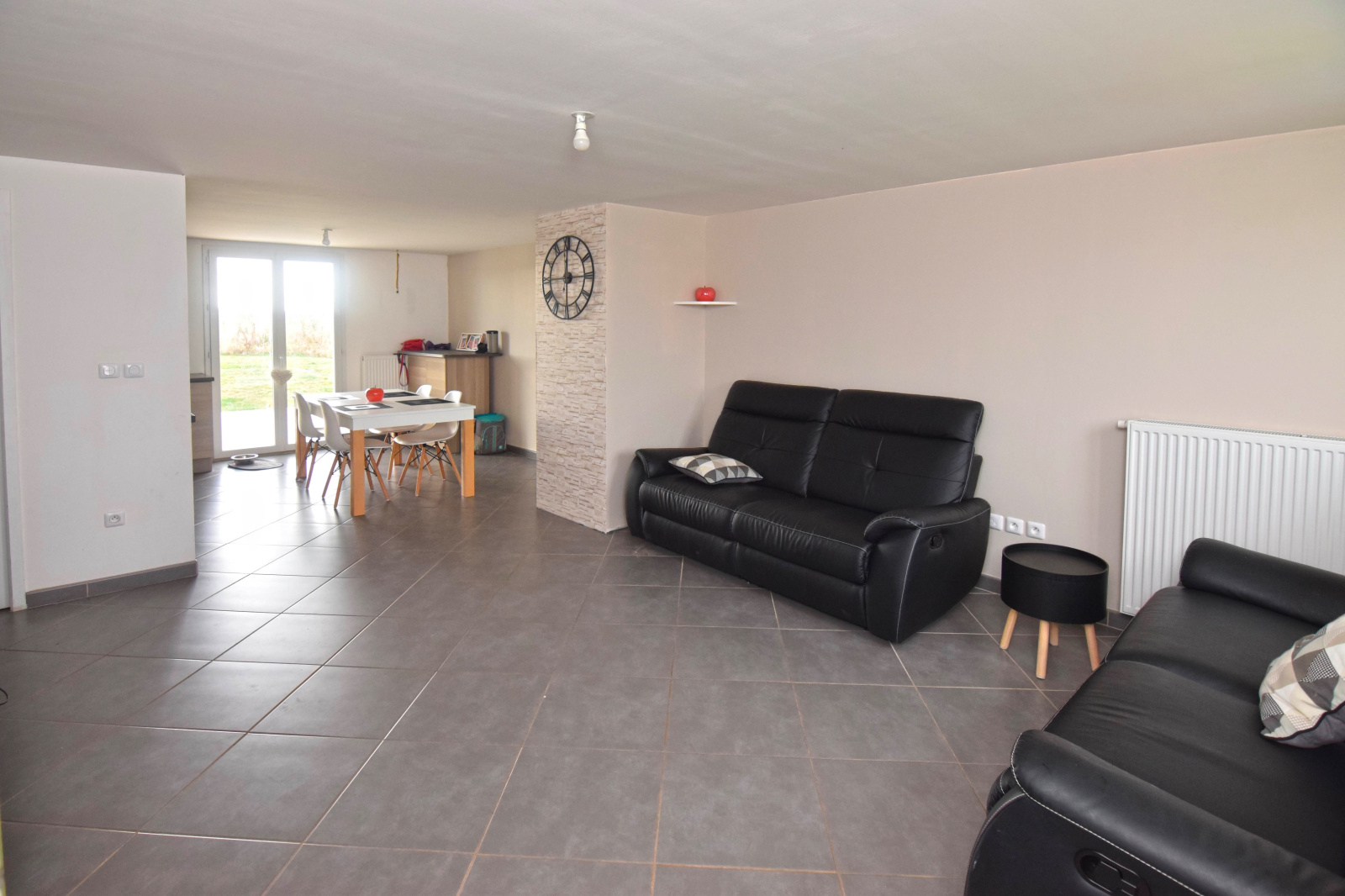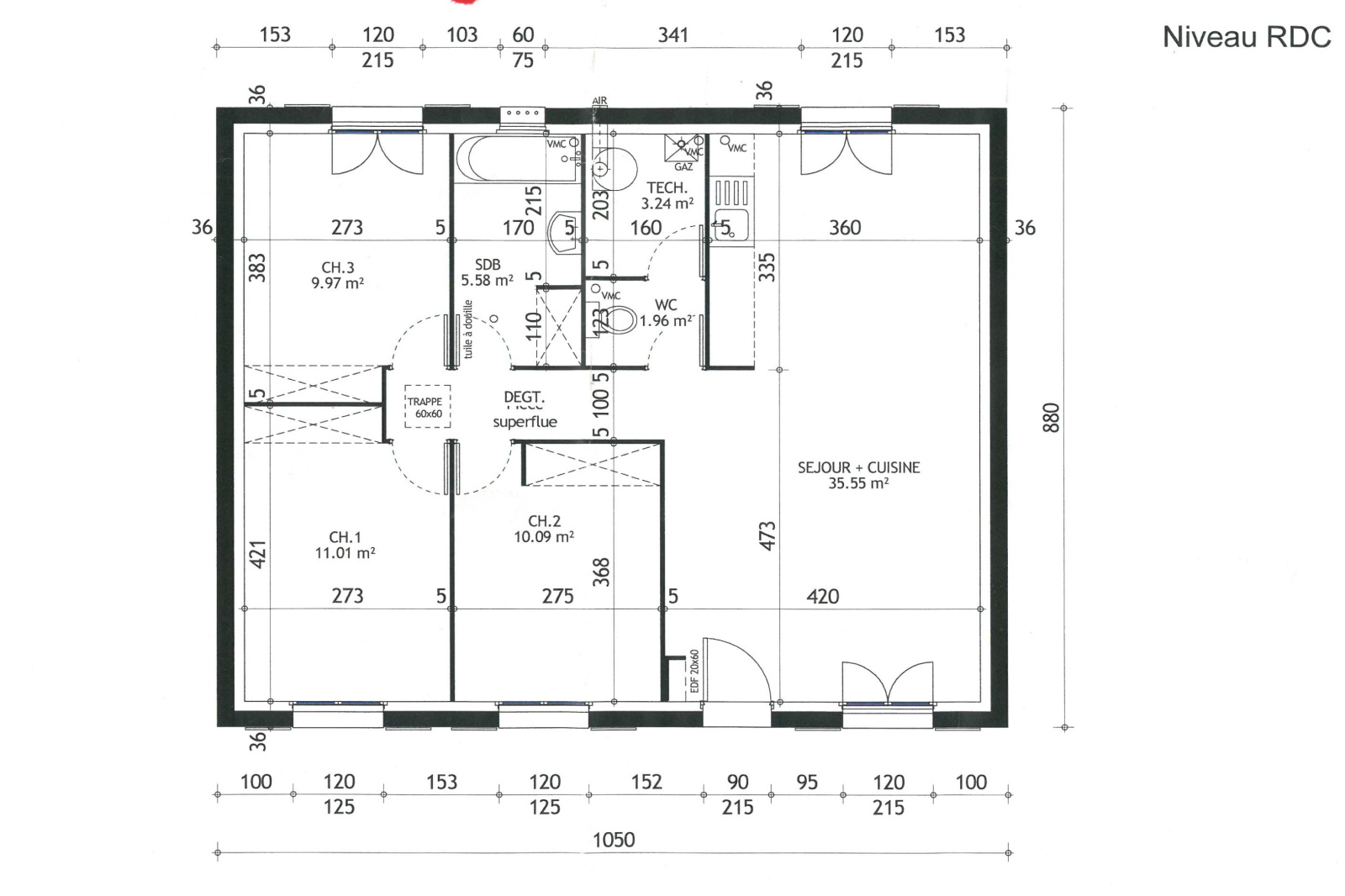 Pavillon individuel de plain-pied et comprenant: Une grande pièce de vie de 32m2 avec cuisine US aménagée et équipée, 3 chambres, salle de bains, WC.